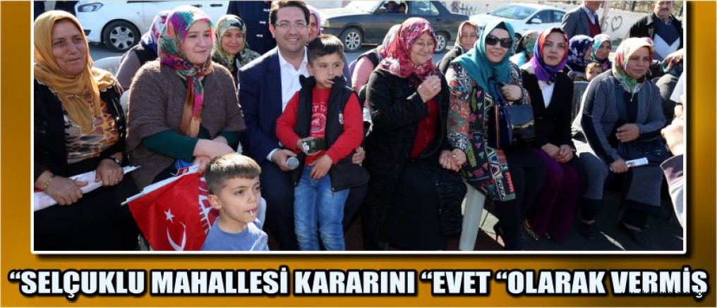 Ak Parti Kadın Kolları tarafından Selçuklu Mahallesinde düzenlenen toplantıya, Aksaray Belediye Başkanı Haluk Şahin Yazgı, Eşi Hasibe Yazgı ve Kadın Kolları Başkanı Fazilet Zehra Köktaş ile çok sayıda hanım davetli katıldı. Aksaray Belediye Başkanı Haluk Şahin Yazgı, 16 Nisan'da yapılacak Cumhurbaşkanlığı Sistemi Referandumu öncesi, 'evet' için yaptığı saha çalışmalarına Selçuklu mahallesinde gerçekleştirdiği mahalle toplantısıyla devam etti. Başkan Yazgı “Daha güçlü bir Türkiye için geleceğimiz için mahalle mahalle, sokak sokak, ev ev gezerek halkımıza neden” evet” denilmesi gerektiğini hemşerilerimizin ayağına gidip anlatacağız” dedi. Başkan Yazgı, Selçuklu mahallesindeki vatandaşlara hitaben yaptığı konuşmada şunları söyledi. ‘‘Önümüzde çok önemli bir seçim var. 16 Nisan’da halk oylaması var. Maddelerden en önemlisi 5 senden 5 seneye seçim olması, koalisyonun olmaması. Biliyorsunuz memleketimiz koalisyon hükümetlerinden çok çekti.