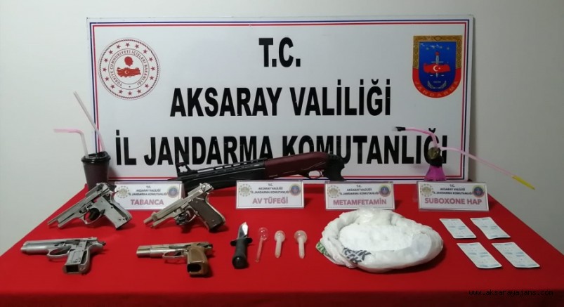Aksaray merkez ilçe Sağlık beldesi mülki sınırları içerisinde uyuşturucu madde imal ve ticareti yapan şahsın yakalanmasına yönelik Cumhuriyet Başsavcılığının talimatları doğrultusunda, 12 Ocak 2022 tarihinde Y.K. isimli şüphelinin evinde, eklentilerinde ve aracında yapılan aramalarda; (1325) gr metamfetamin, (50) cc sıvılaştırılmış metamfetamin, (28) adet uyuşturucu hap, (4) adet uyuşturucu kullanma aparatı, (4) adet ruhsatsız tabanca, (1) adet ruhsatsız av tüfeği ve (1) adet kama ele geçirildi.
