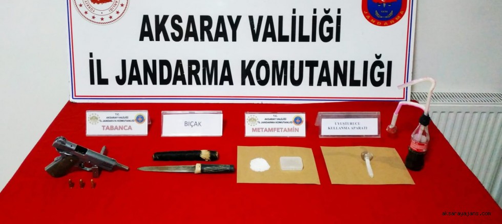 Bu kapsamda; Aksaray Cumhuriyet Başsavcılığının talimatları doğrultusunda, Aksaray İl Jandarma Komutanlığına bağlı İstihbarat Şube Müdürlüğü ve Merkez İlçe Jandarma Komutanlığı ekiplerince yapılan istihbari çalışmalar sonucunda, Merkez İlçe mülki sınırları içerisinde Uyuşturucu veya Uyarıcı Madde İmal ve Ticareti yaptığı tespit edilen B.A.G. isimli şahsın üzerinde ve işyerinde yapılan aramalarda; (8) gram metamfetamin, (1) adet ruhsatsız tabanca ve şarjörü, (3) adet 9 mm tabanca fişeği, (1) adet kama bıçağı ve (2) adet uyuşturucu madde kullanma aparatı ele geçirilmiştir.